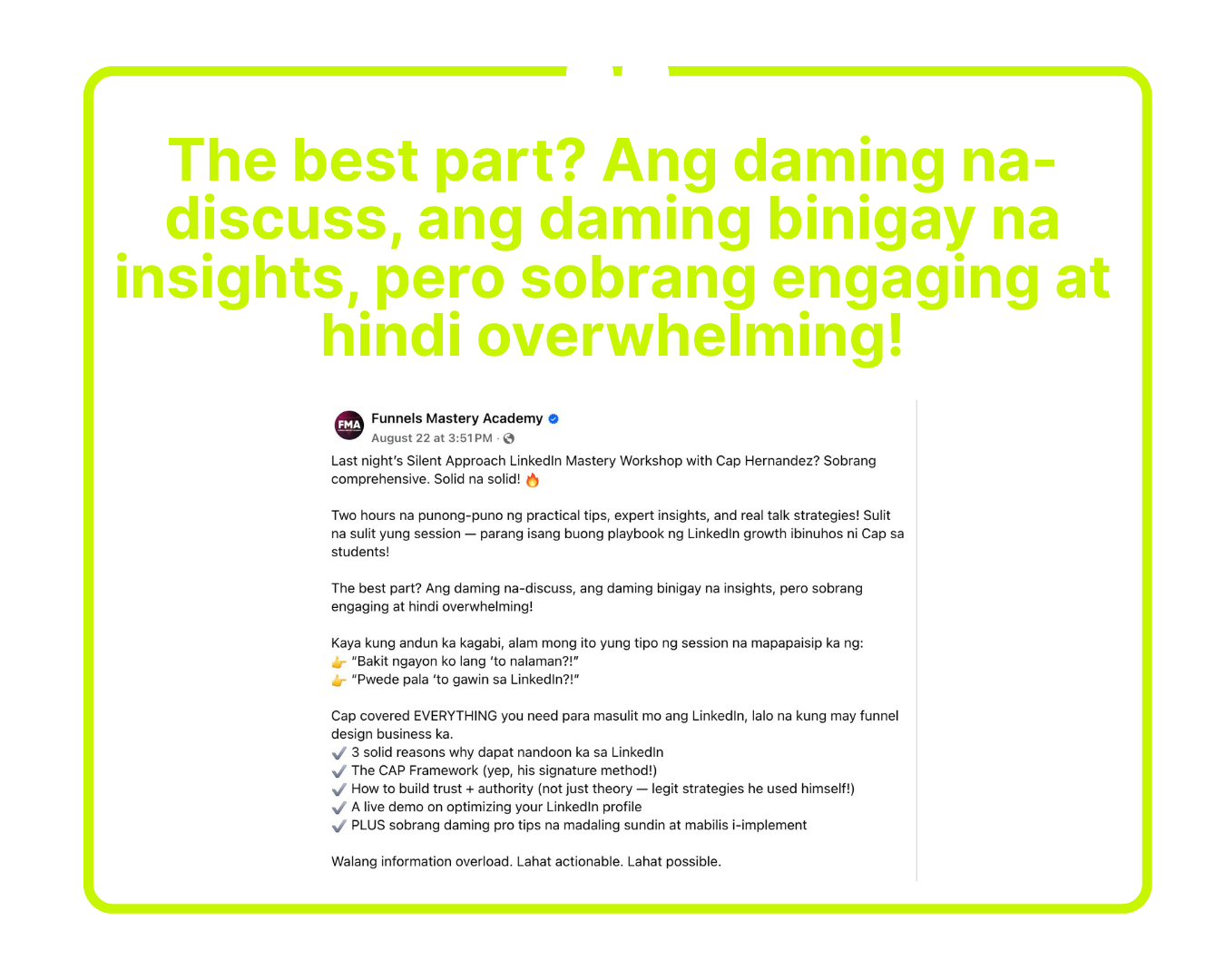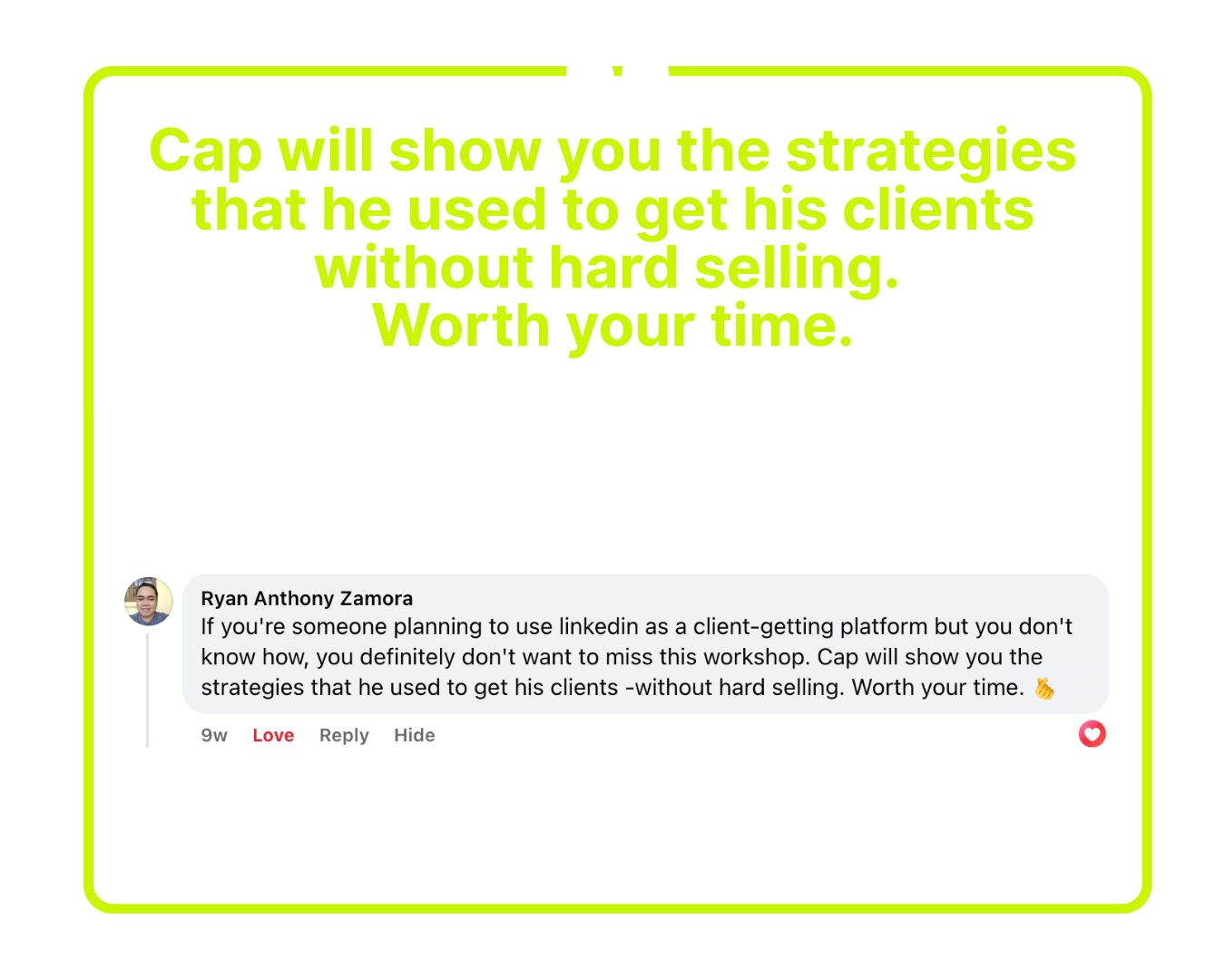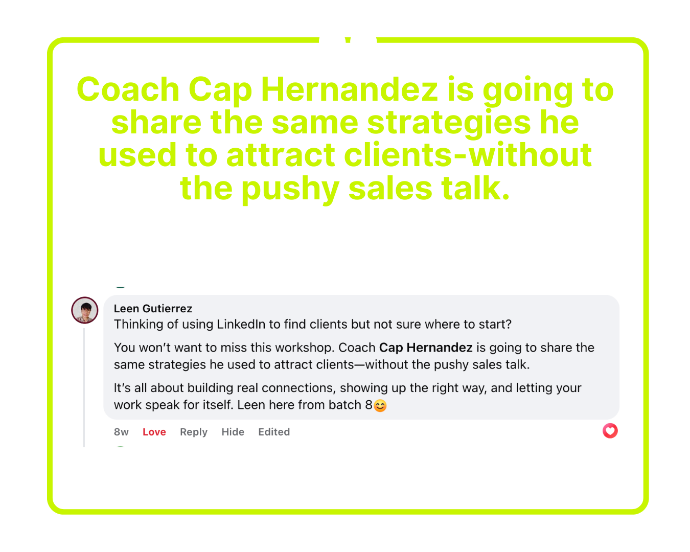 In the Silent to Sold Workshop, I’ll show you how to build a personal brand that pre-sells you in and out of LinkedIn, so clients come to you without cold calls or pushy tactics.